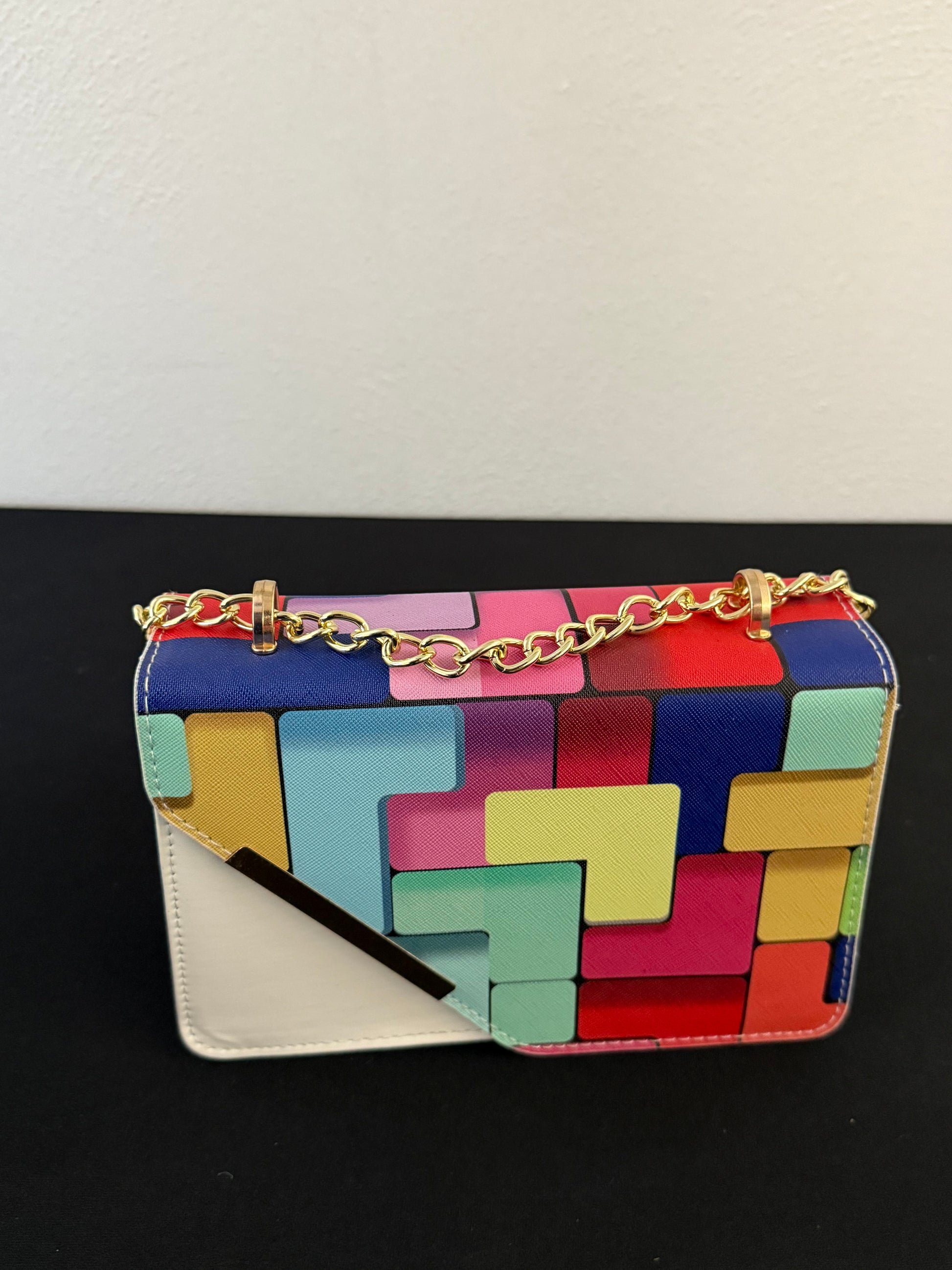 Bring playful color and sharp structure to your look with The Puzzle Block Crossbody! This eye-catching purse features a bold, multi-colored geometric block print that is both nostalgic and incredibly modern. With its structured silhouette and luxurious gold-tone chain, this bag is a show-stopping accessory perfect for turning casual outfits into artistic statements.